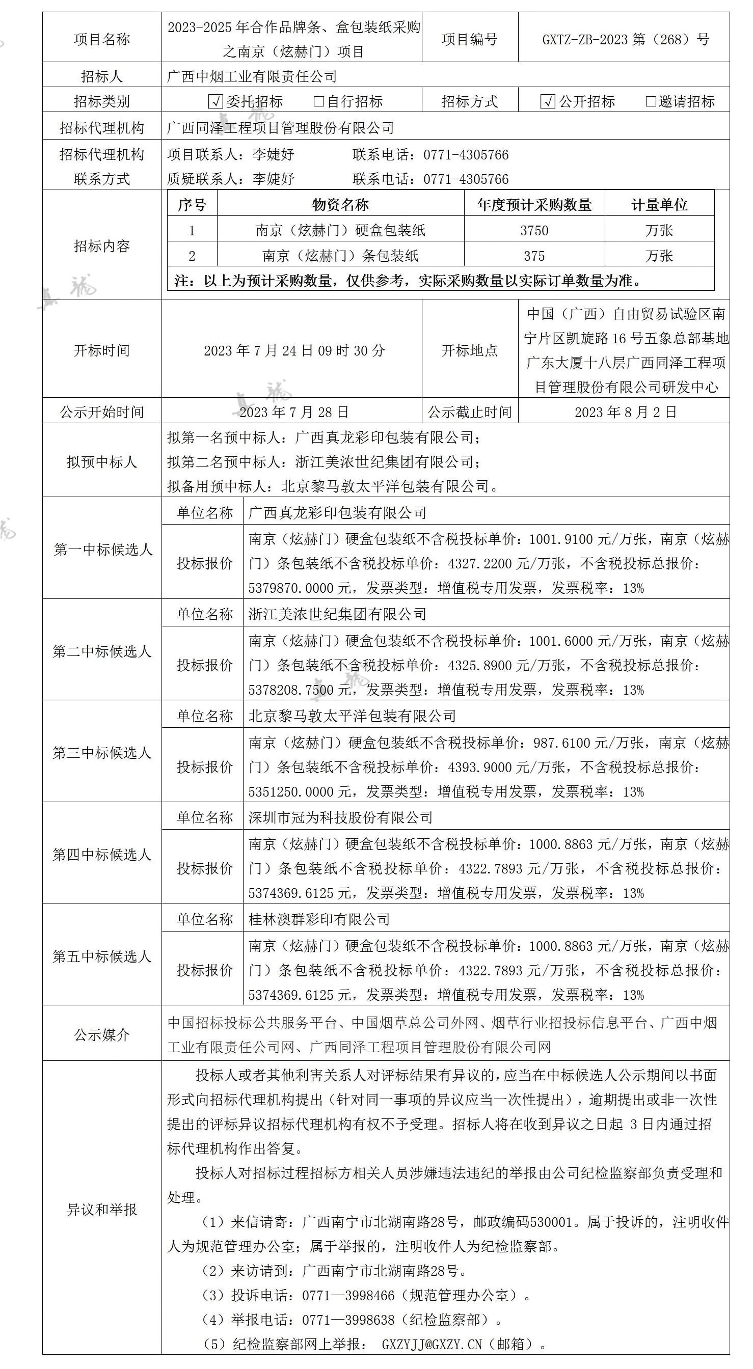 广西中烟工业有限责任公司2023-2025年合作品牌条、盒包装纸采购之南京(炫赫门)项目(项目编号:GXTZ-ZB-2023第(268)号)中标候选人公示