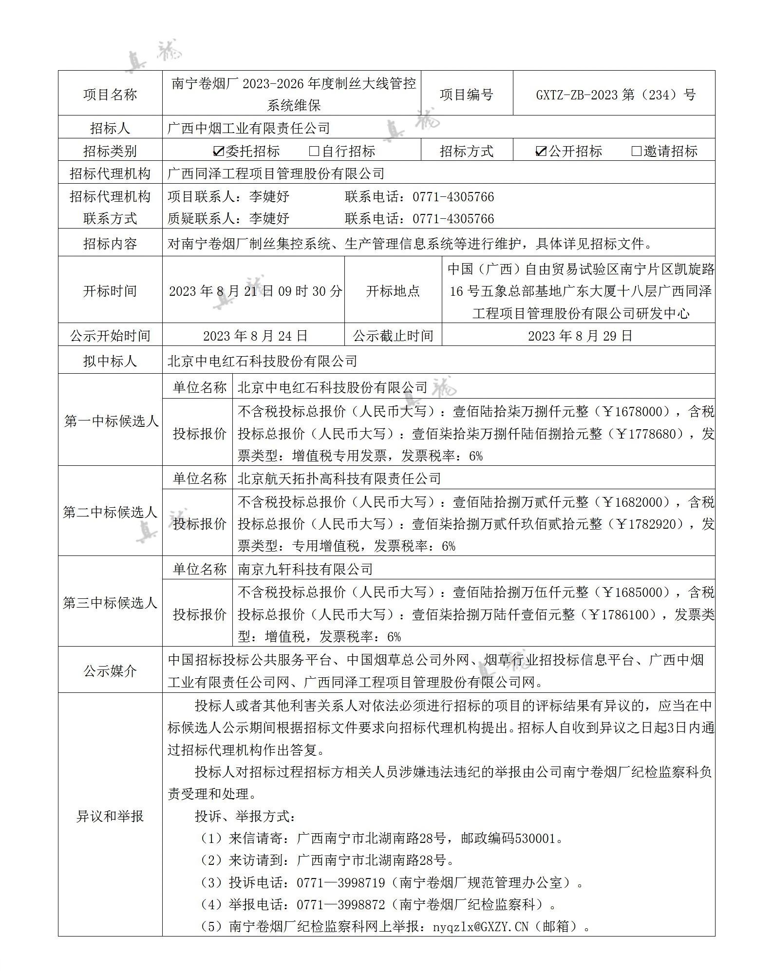 广西中烟工业有限责任公司南宁卷烟厂2023-2026年度制丝大线管控系统维保(项目编号:GXTZ-ZB-2023第(234)号)中标候选人公示