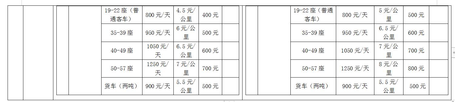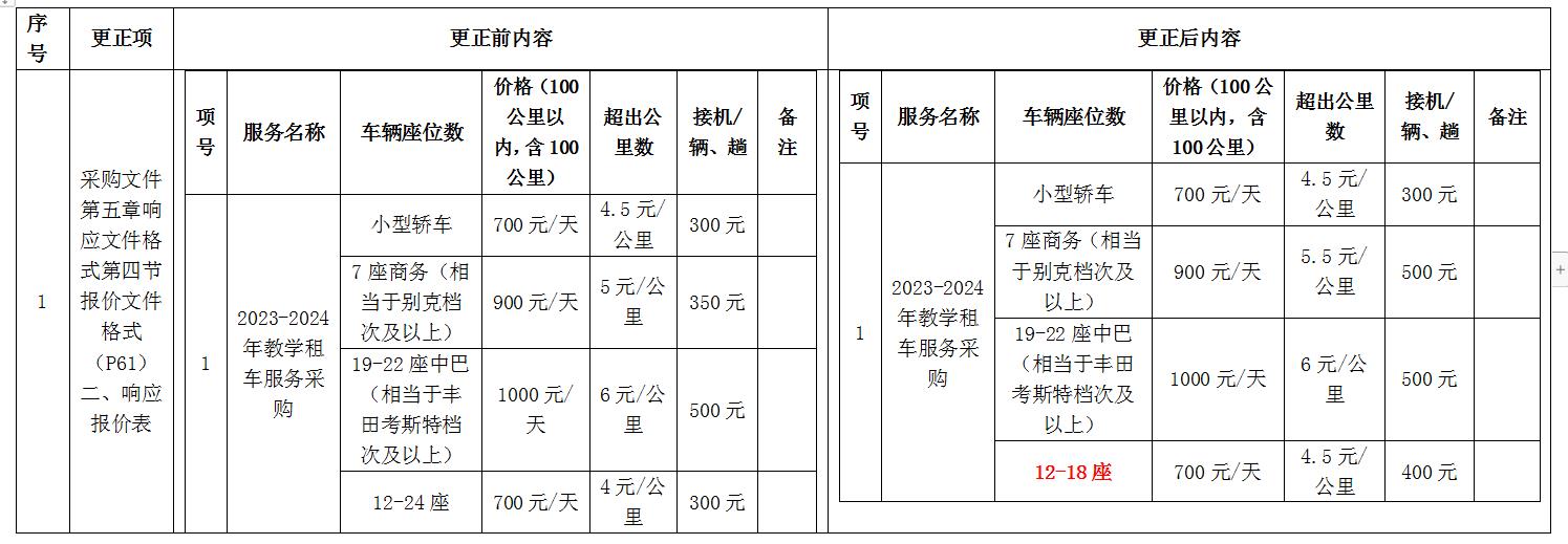更正内容:招标文件中,所有租车价目表以更正后内容为准: