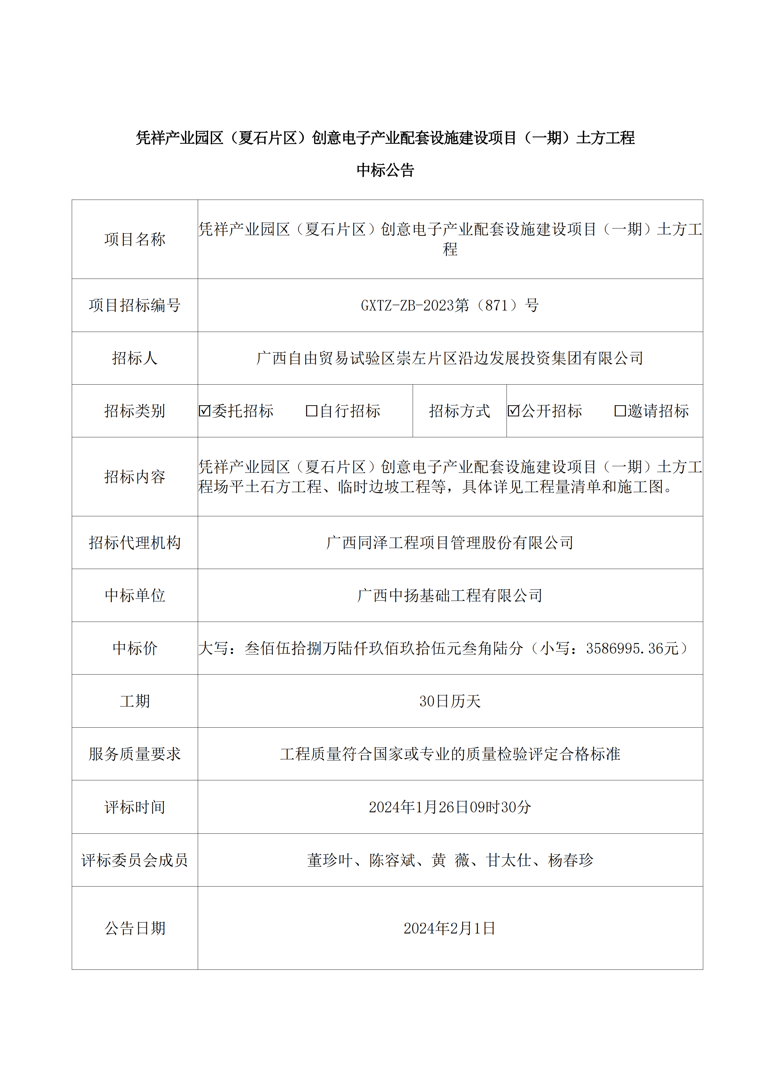 凭祥产业园区(夏石片区)创意电子产业配套设施建设项目(一期)土方工程中标公告