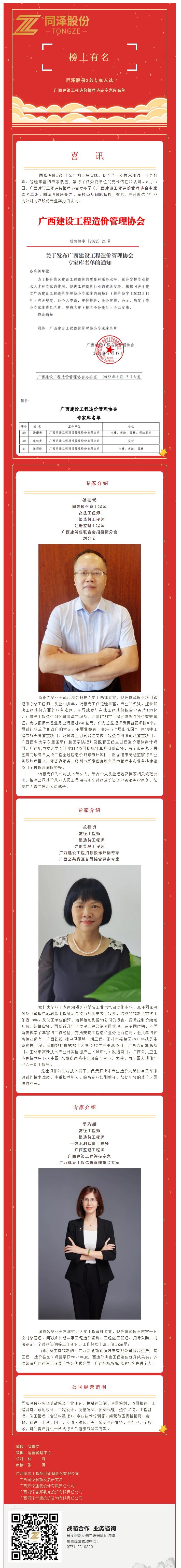喜讯 | 同泽股份3名专家入选广西建设工程造价管理协会专家库名单