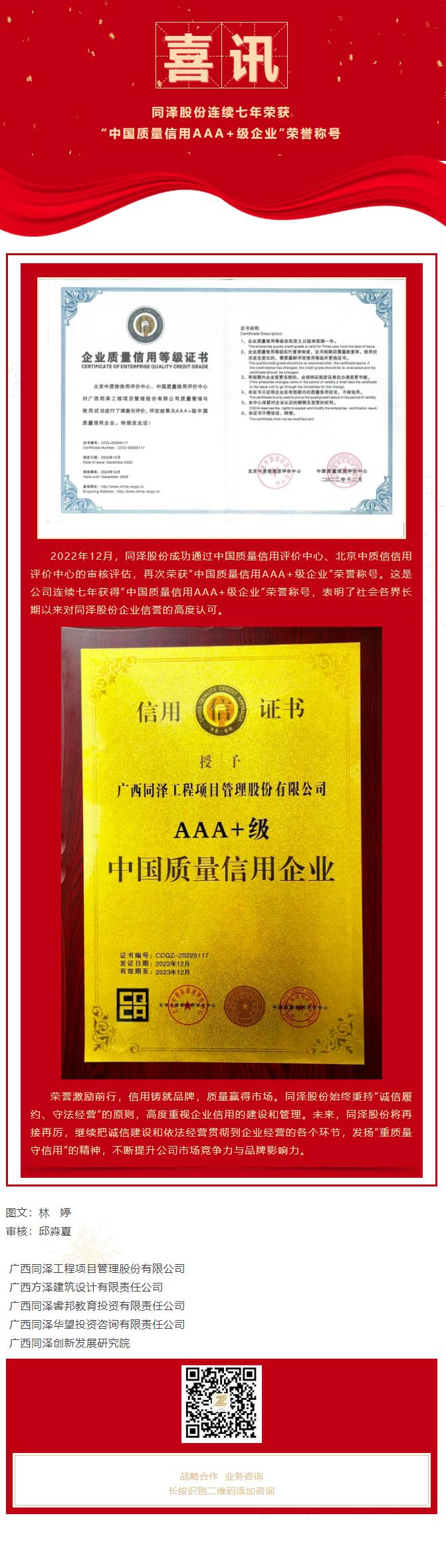 喜讯 | 同泽股份连续七年荣获“中国质量信用AAA+级企业”荣誉称号